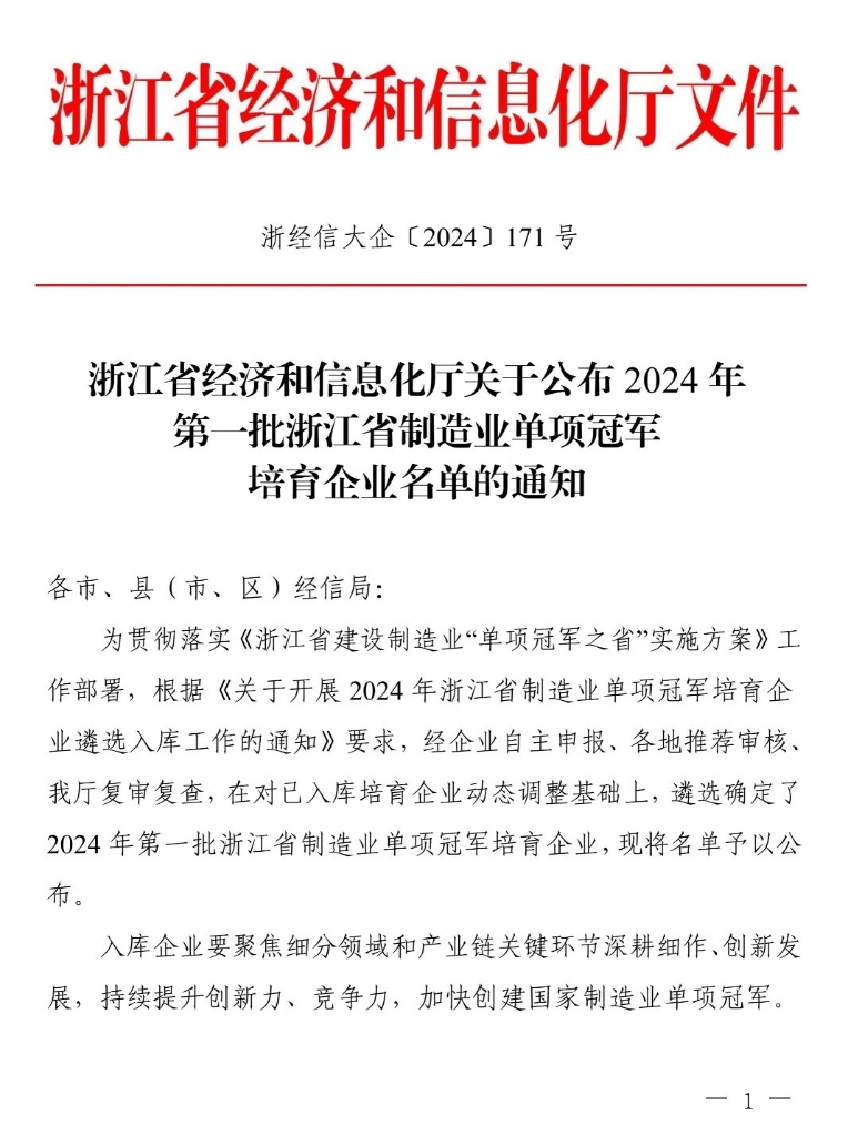 日前,,,,,,,浙江省经济和信息化厅宣布了2024年第一批浙江省制造业单项冠军培育企业名单,,,,,,,凭证《关于开展2024年浙江省制造业单项冠军培育企业遴选入库事情的通知》要求,,,,,,,经企业自主申报、各地推荐审核、省厅复审复查,,,,,,,云顶国际vip.888荣登榜单。。。。。