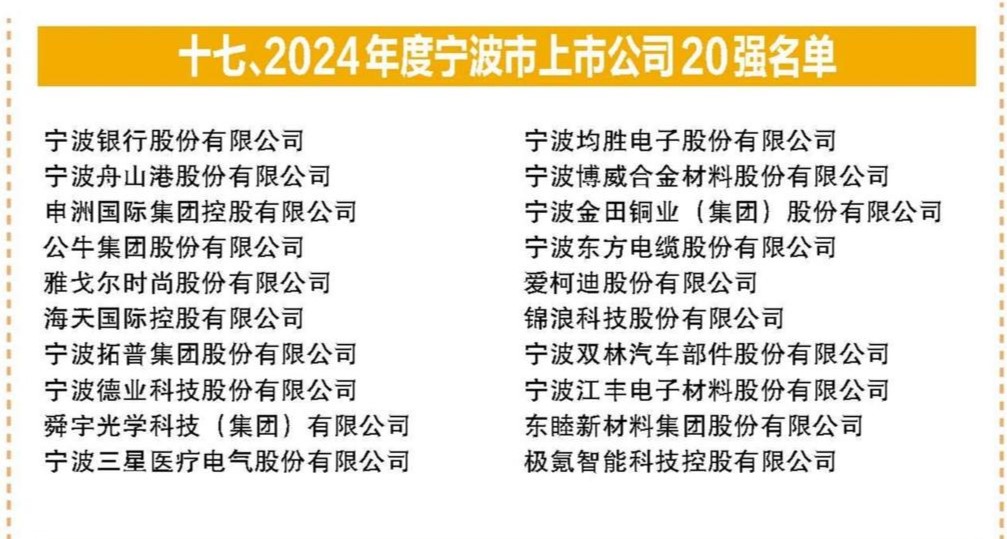 云顶国际vip.888股份荣登“2024宁波上市公司20强”榜单